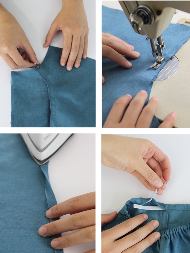 7. Press the waist edge 1cm to the wrong side twice, and pin it in place. Edge-stitch the fold down almost all the way around the waist, leaving a 4cm gap for inserting the elastic at the beginning and end.