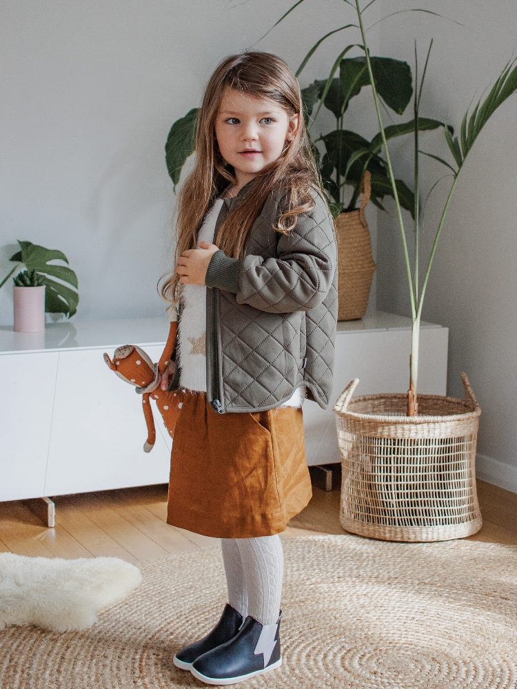Wheat Loui thermo jacket in dark army, $69, littlebambinos.co.nz; Postie little girls’ eyelash knit in white stars, $15, postie.co.nz; Little Perriam Elsie linen skirt in ochre, $75, perriam.co.nz; Lamington merino cable tights in oatmeal, $33.95, lamington.co.nz; Pretty Brave Electric boot in black/grey, $79.95, prettybrave.com. Aria is holding Maileg Bambi Girl, $85, thegatheredstore.com.