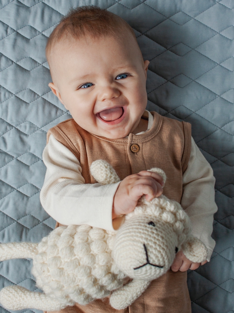 Buck and Baa organic jumpsuit in hazelnut, $49, buckandbaa.com; Postie baby rib bodysuit in white, $5, postie.co.nz; Nobodinoz Kiowa play mat in Riviera blue, $199, littlewhimsy.co.nz. Lamb toy model’s own.