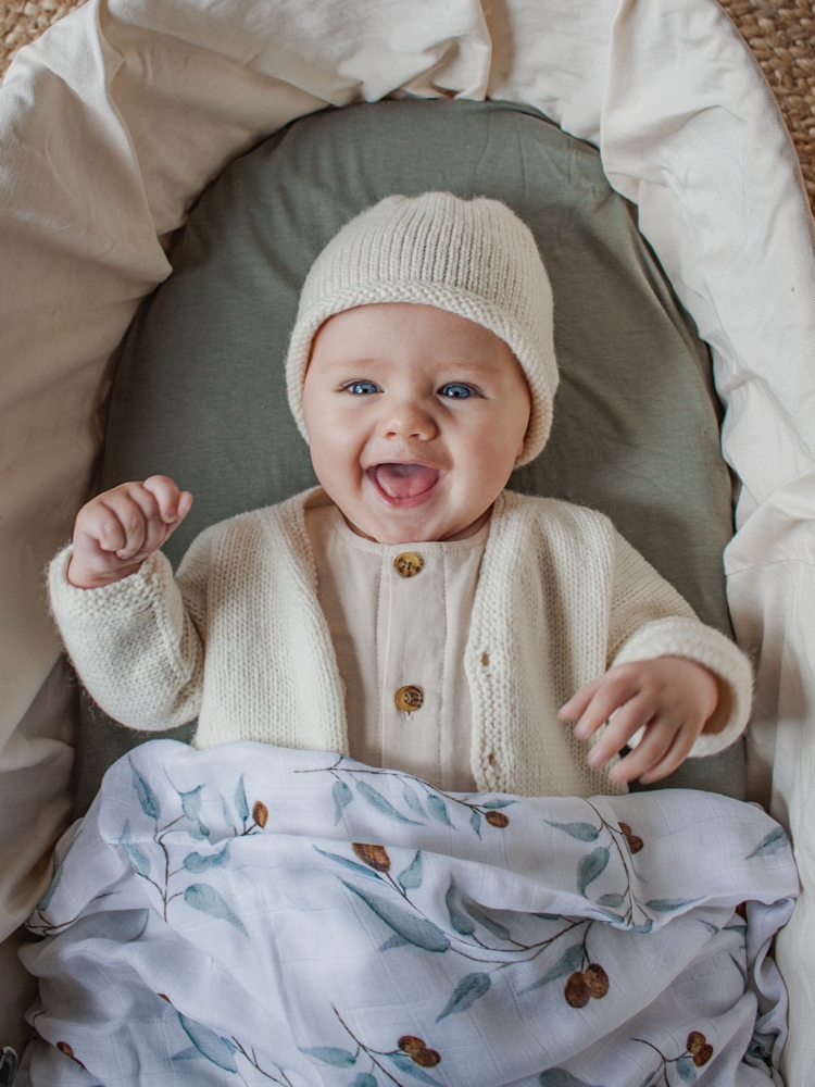 Arlo wears: Weebits knitted beanie, $32, and cardigan, $76, both in natural, weebits.co.nz; Postie baby 100% cotton linen-look romper in beige, $15, postie.co.nz. Bassinet (stylist’s own) fitted with Nature Baby organic cotton sheet (from a set) in brook, $74.95, naturebaby.co.nz; Piper Bug bamboo muslin swaddle in Ray, $42, littlewhimsy.co.nz.