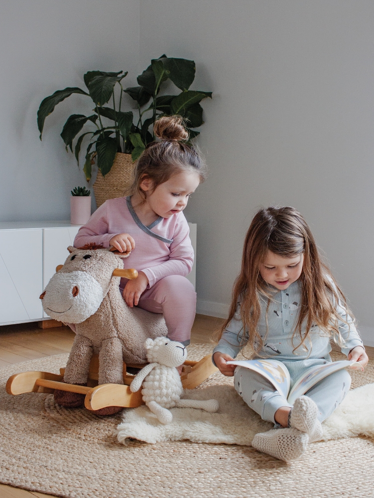 Mila wears: Merino Kids merino pyjamas in pink, $99, merinokids.co.nz. Aria wears: Nature Baby cotton rib long-sleeved PJ set in geese print, $54.95, naturebaby.co.nz; Weebits knitted toddler slippers in natural, $40, weebits.co.nz. Toys models’ own.