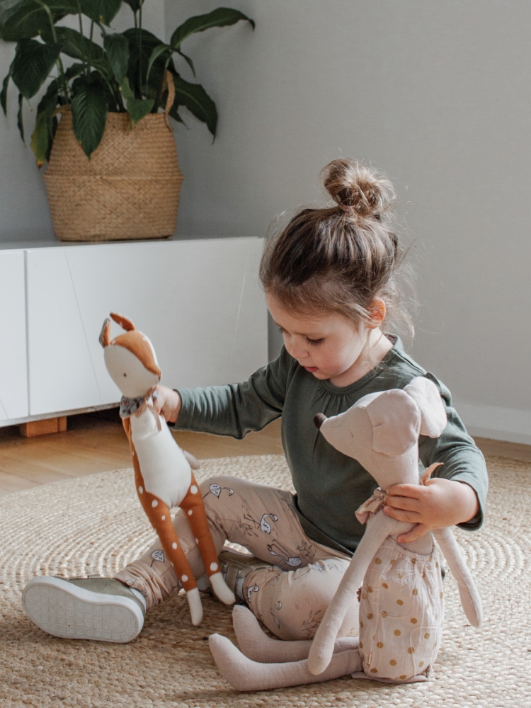 Babu merino ruffle girl’s tee in khaki, $42, babu.co.nz; Rylee + Cru flamingo leggings in blush, $56, littlebambinos.co.nz; Pretty Brave XO trainer in gold, $89.95, prettybrave.com. Mila plays with Maileg Bambi Girl, $85, and Maileg Circus Girl Mouse, $136, thegatheredstore.com.