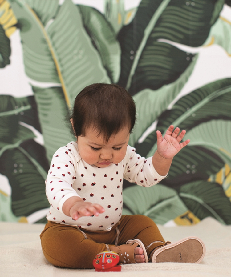 Nature Baby long sleeve kimono bodysuit in ladybird print, $29.95, naturebaby.co.nz; Little Perriam Long John leggings in salted caramel, $65.95, perriam.co.nz; Pretty Brave Menorca little deer sandals $54.95, prettybrave.com. Djeco Animambo castanet, $8.50, smithandcaugheys.co.nz.