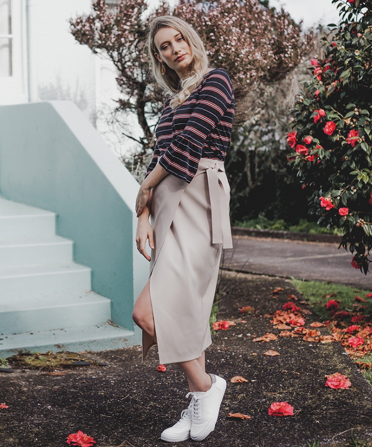 Max Taylor frill sleeve tee in assorted stripe, $69.99 from Max; Witchery wrap tie skirt in sandstone, $149.90, witchery.co.nz; Mi Piaci Tonya sneakers in white, $220, mipiaci.co.nz; Earrings, model’s own.