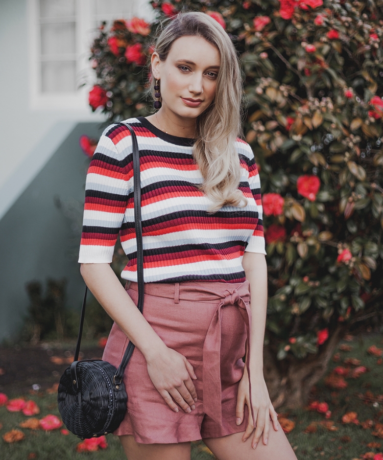 Dotti ripe stripe jumper, $39.90, and wicker canteen bag in black, $39.99, dotti.co.nz; Witchery Edie tie belt shorts in rosewood, $139.90, witchery.co.nz; Earrings, stylist’s own.