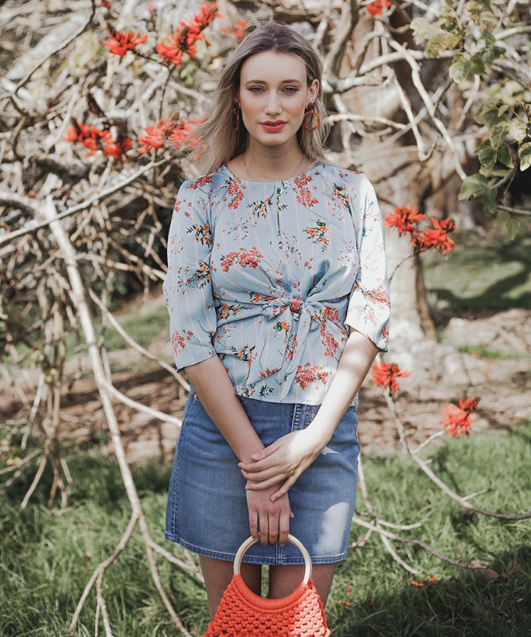 Dotti Valerie tie-front blouse, $39.99, dotti.co.nz, Just Jeans Amaze denim skirt in mid blue, $69.99 from Just Jeans; Glassons knit bag in living coral, $39 from Glassons.
