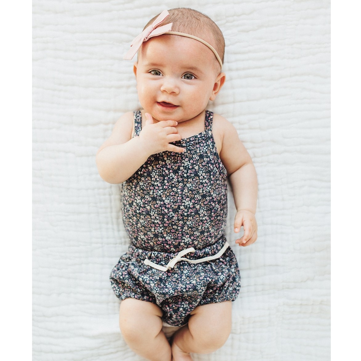 Jamie Kay winter floral singlet bodysuit, $29, and bloomers, $24.95, jamiekay.co.nz; Bonnie & Harlo fabric bow in dusty pink, $16, 2littlerascals.nz.