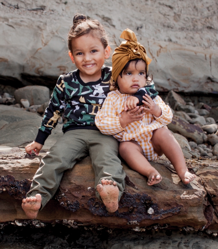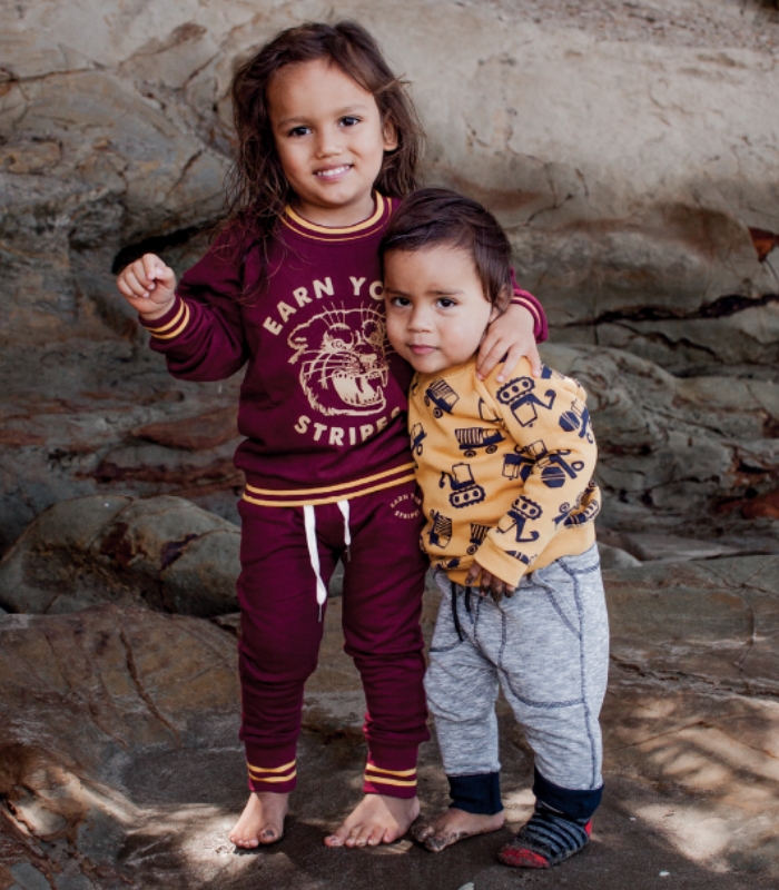 Lennox wears: Ricochet Kids everyday sweatshirt in digger print, $16.99, and trackpants in salt and pepper, $16.99, babyfactory.co.nz; Sock, model’s own to protect an ouchie :)