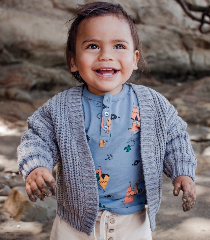 Lennox wears: Postie henley long-sleeve tee in blue camel, $5, postie.co.nz; Huxbaby chunky knit cardigan, $79.95, thegatheredstore.com; Buck & Baa shorts in oat, $34, buckandbaa.com.