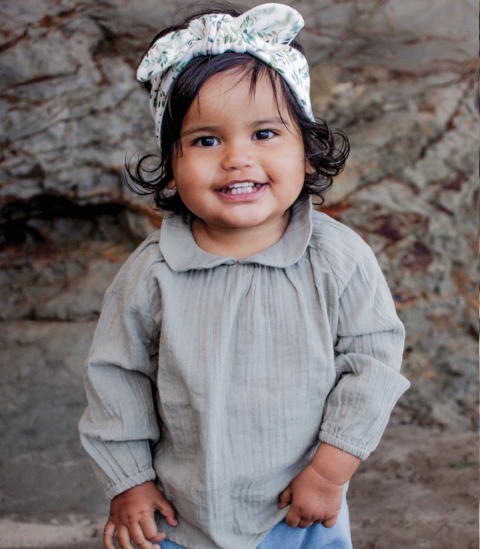Fawne Boutique leafy topknot bow, $19.50, fawneboutique.com; Nature Baby Cameron muslin blouse in brook, $44.95, and Dreamer pants in sky, $44.95, naturebaby.co.nz.