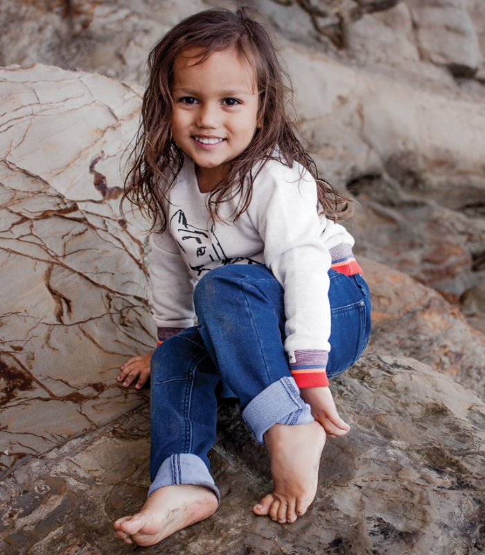 Billybandit My Ball sweatshirt, $78.90, smithandcaugheys.co.nz; Kmart knit denim jeans, $17 from Kmart.