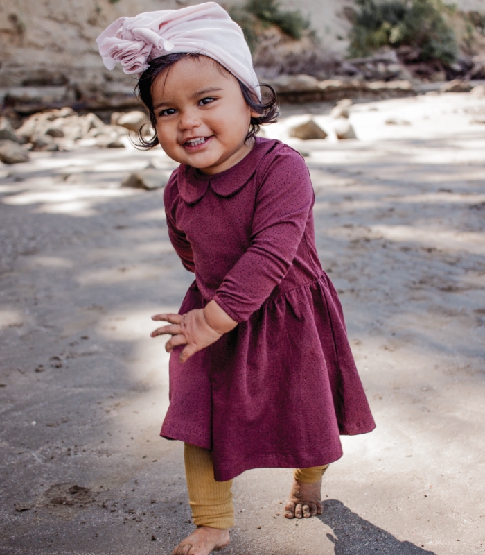 Nature Baby Edith dress, $49.95, naturebaby.co.nz; Jamie Kay cotton modal leggings in golden, $27.95, thegatheredstore.co.nz; Vida & Co merino ruffle headwrap in blush, $30, vidaandco.co.nz.