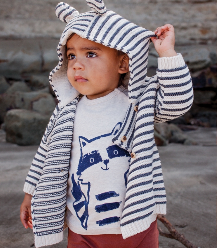 Ricochet Baby racoon bodysuit top, $14.99, and knitted stripe jacket, $29.99, babyfactory.co.nz; Buck & Baa leggings in russet, $34, buckandbaa.com.