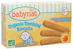 Made in France, these mildly sweet, slightly orange-flavoured teething rusks look like miniature ladyfingers (you know, the kind of biscuits you use to make a trifle or a tiramisu). They're organic and contain no GMOs (genetically modified organisms).