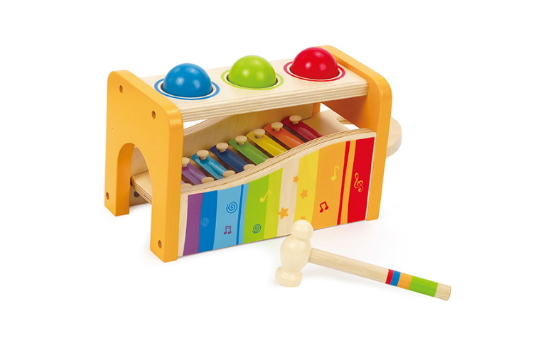 Hape Pound & Tap Bench - Pounding sends the balls tinkling over the xylophone. Pull out the keyboard and the xylophone can be played solo. Winner of the 2018 Cribsie Award - Favorite First Musical Toy