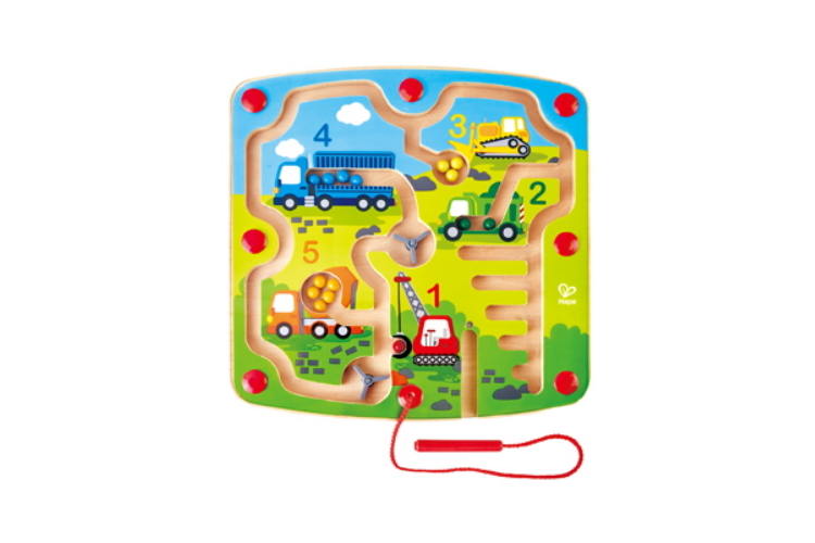 Hape Construction & Number Maze - This fantastic magnetic construction site and numbers maze is a fun way to walk around the building site and learn about construction vehicles and counting. You can tilt the board or use the wand to guide the magnetic balls through the maze of pathways, corners and revolving doors!