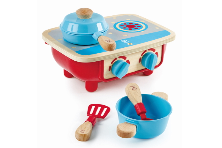 Hape Toddler Kitchen Set - Prepare delicious meals for your family and friends! This fun wooden stove comes with one pot with lid, one frying pan, one spoon and one spatula for you to cook with. Features knobs which click cutely when turned. Store your pot and pan in the spaces behind the hob when you're done.