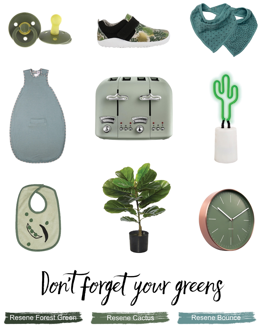Bibs dummy in hunter green, $15.95 for set of two, thegatheredstore.com; Bobux Aktiv Habitat sneaker, $90, bobux.co.nz; Burrow & Be Wilder Garden 100% organic cotton muslin bandana bib set in ocean, $29.95, burrowandbe.co.nz; Babu merino sleeping bag in green, from $155, babu.co.nz; DeLonghi Argento 4-slice toaster, $129.99, smithandcaugheys.co.nz; Sunnylife neon cactus light, $49.50, alliuminteriors.co.nz; Nature Baby reversible bib in peas print, $19.95, naturebaby.co.nz; Rogue fiddle leaf faux plant 55cm, $49.95, freedomfurniture.co.nz; Karlsson minimal copper clock in green, $109, shutthefrontdoor.co.nz.