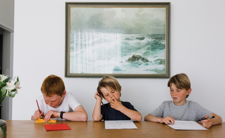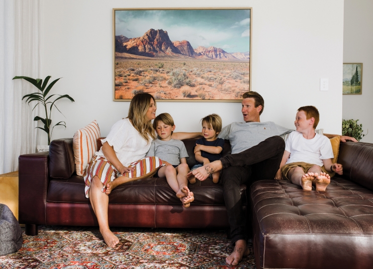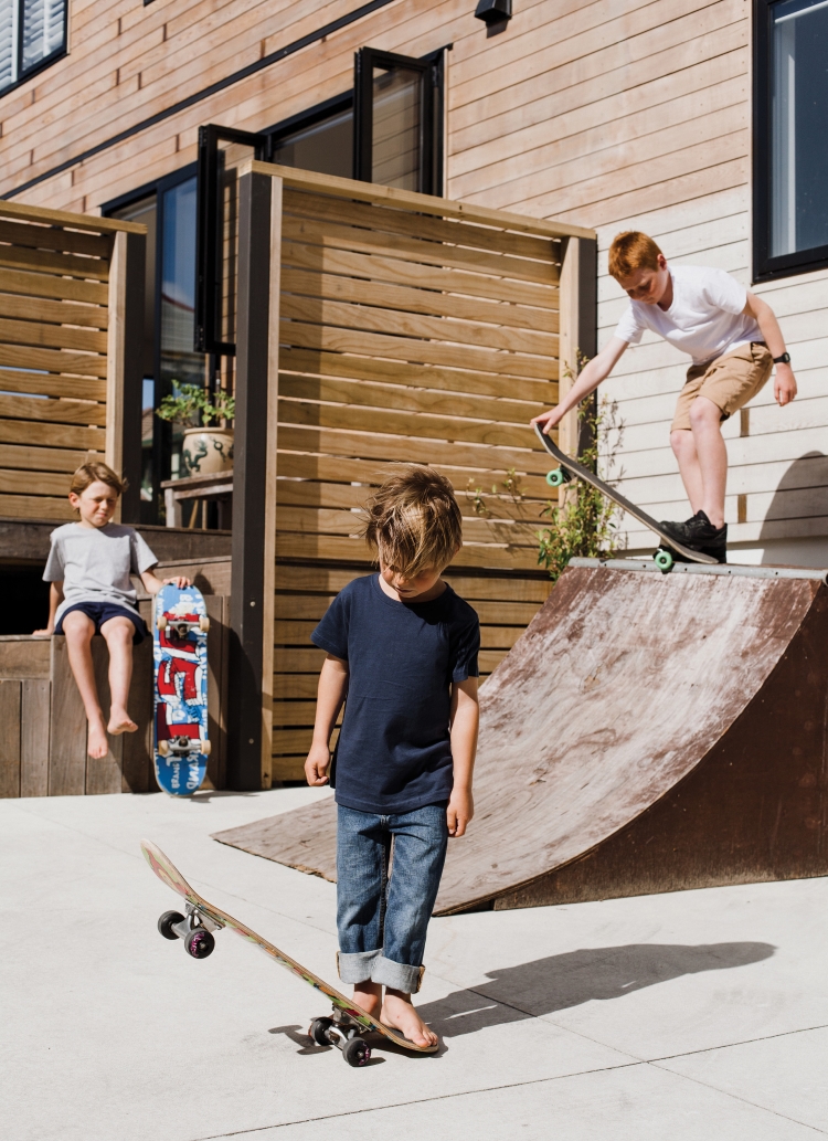 Abby and Sam Cummins live in Mount Maunganui with their three medium-sized boys: Connor, ten; Ikey (short for Isaac), eight; and Ari, five. They moved there from Muriwai, on the west coast of Auckland, about four years ago, to be closer to family, friends and “relatively empty roads”. Their free time involves plenty of skating, surfing, biking, running, reading and cooking. And laughing. Sam has a mean sense of humour and a seasoned imagination – summing up his boys’ personalities by likening them to celebrity chefs: Connor, we’re told, is Gordon Ramsey, Ikey is Jamie Oliver and Ari is Action Bronson.