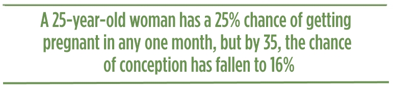A 25-year-old woman has a 25% chance of getting pregnant in any one month, but by 35, the chance of conception has fallen to 16%. At 38 it is about 11% and at 40 it is just 6%.
