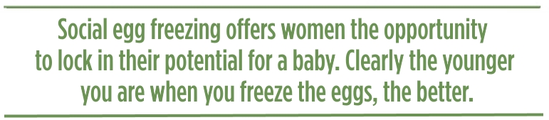 Social egg freezing offers women the opportunity to lock in their potential for a baby. Clearly the younger you are when you freeze the eggs, the better. For example, the chances of having a baby naturally at age 30 is about 20% per month, but reduces to 5% per month by age 40. Some women do manage to conceive naturally, however we see many people in this age group who need fertility assistance.