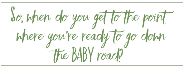So, when do you get to the point where you're ready to go down the baby road? And perhaps, more to the point, how do you know when it's right? I have no idea. Having a baby will be the biggest responsibility you ever take on. How do you anticipate how your life will change and brace yourself for it? Pass. I think everyone just wings it and that the only people who have an idea what you may need to know to prepare for a baby, or exactly how big a shock it's going to be, are the people who have them already… which is a fat load of good to us newbies. I don't imagine the enormity of it all hits you until you hold your baby in your arms, look into its eyes for the first time… and make a grab for the gas again. Looking back at you is a brand new person that is your responsibility to keep safe, to mould and to raise the best you can. Yikes.