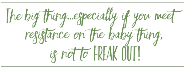 The big thing that you really have to consider with blokes, especially if you meet resistance on the baby thing, is not to freak out that he doesn't want children (unless of course he actually says that he doesn't want children, then feel free to freak out completely), he probably just needs a bit of space to mull things over. As women our biological clocks have been ticking away, and we get to a point where we are distinctly aware of our monthly cycles, the purpose behind it all, and our hormones (which men are terrified of) are starting to stamp their feet. But men don't experience that. They just blissfully cruise along until their wife or partner sticks a foot out in front of them so to speak. Mind you, having said that, once they realize it's curtains, they're pretty practical sorts! It didn't take long for my husband to put two and two together and realize how much… uhh… you know… would be involved in trying to make a baby. He was pretty cheerful about it all after that.