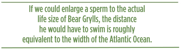 To tell this story, imagine that instead of sperm we have millions of tiny Bear Grylls. If we could enlarge a sperm to the actual life size of Bear Grylls, the distance he would have to swim is roughly equivalent to the width of the Atlantic Ocean. Not only that, but he’d only have 12 to 24 hours to find his prize, the egg, as that is how long the egg will survive unless it is fertilised.