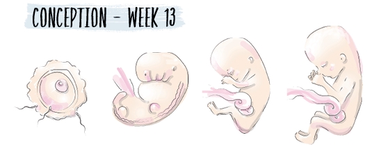 From weeks seven to twelve, tiny arms, legs, hands and feet take shape, and the tissue types that will eventually become bones and muscles become distinct. By the end of the trimester, Baby is about seven centimetres long.