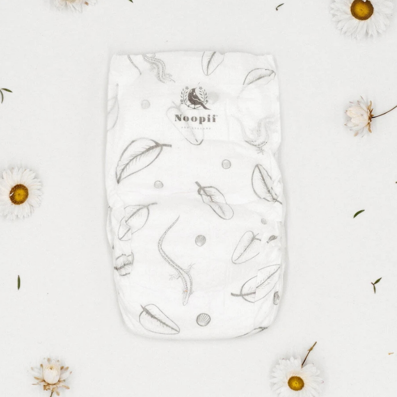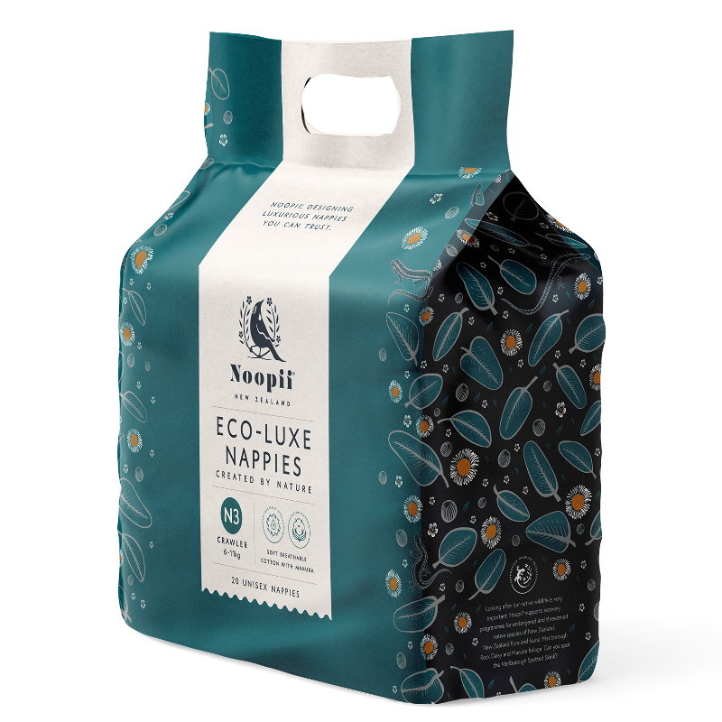 Each Crawler pack contains 20 nappies made from a cotton blend outer, printed with food-safe inks and contain Manuka Hydrosol. Our Crawler nappies and outer packaging are printed with an illustrated pattern and feature our rare Marlborough spotted skink hiding amongst native Marlborough rock daisy flowers and foliage. Our nappies and packaging are made from 70% plant-based sustainable and renewable materials, making them kinder to environment without compromising on performance, quality, design and comfort.